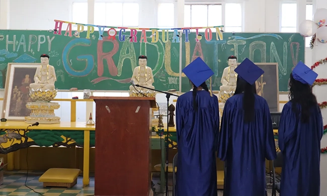 道源堂的南牆上懸著三幅巨大的畫像,中間為釋迦牟尼佛,其左為虛老畫像,其右則是上人的畫像,每次一走進去便覺肅穆、寧靜。而今天有所不同:畫像前搭著高臺,臺下左右排著兩列椅子,四處懸浮著各式各樣的氫氣球,氣球表面一律是“GRADUATION”(畢業)的字樣,學生和來賓們的臉上也都洋溢著興奮和喜悅的柔光。今天道源堂的氣氛是如此的莊嚴而又輕快。