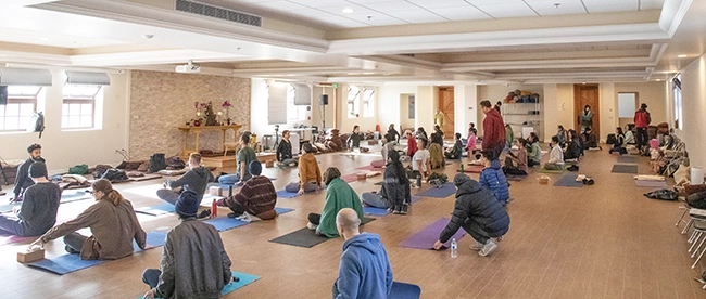 The spring Contemplative Exercise Immersion (CEI) on yoga and yogācāra was led by yoginī Sandy Lamerson and DRBU faculty March 10-13 in the Earth Treasury Hall. Taking a break from classes and nonessential work-study, faculty, staff, and students dove deep into Patañjali’s eight limbs of yoga, supplemented by parallel practices from yogācāra. While DRBU offered a yoga CEI led by Fabrizio Alberico in 2018 for a single cohort, this year was the first time that the entire university spent four days directly experiencing yoga practices together.