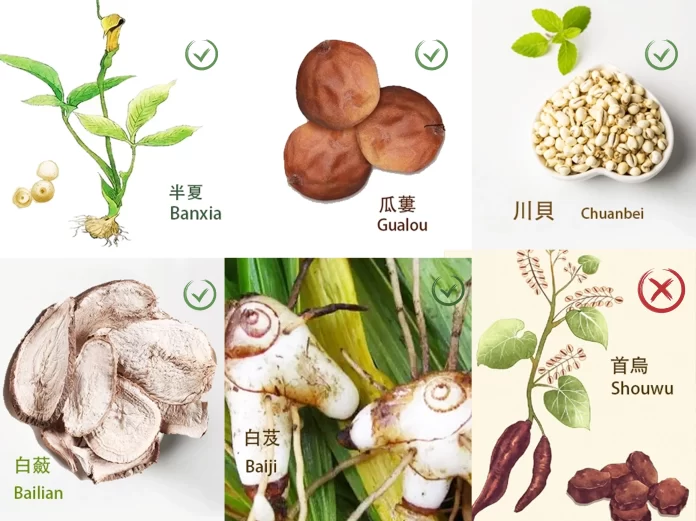 “Ban Lou Bei Lian Ji Gong Wu.” The book of materia medica specifically talks about eighteen incompatibles among medical substances. What are they? It says “Ban Lou Bei Xian Ji Gong Wu.” Ban refers to Ban Xia (Pinelliae Rhizoma preparatum), and Lou refers to Gua Lou (Trichosanthis Fructus). Among Gua Lou, there is also Gua Lou Ren (Trichosanthis Semen), Gua Lou Zi (Trichosanthis Semen), and Gua Lou Gen (Trichosanthis Radix). This is Gua Lou. “Ban Lou Bei” Bei refers to Chuan Bei, Chuan Bei Mu (Fritillariae cirrhosae Bulbus). Lian refers to Bai Lian (Ampelopsis Radix), another name for a medical ingredient. Ji refers to Bai Ji (Bletillae Rhizoma). These five flavors are Ban Xia, Gua Lou, Chuan Bei, Bai Lian, and Bai Ji. “Gong Wu” refers to those with the word Wu. For example, Chuan Wu (Aconiti Radix Preparata), Cao Wu (Aconiti Kusnezoffi Radix), He Shou Wu (Polygoni multiflori Radix preparata), all these with the word Wu. All these Wu, Wu refers to the color black, they will struggle with these substances. Gong refers to a forward attack. “Ban Lou Bei Lian Ji Gong Wu.” This is the second sentence.